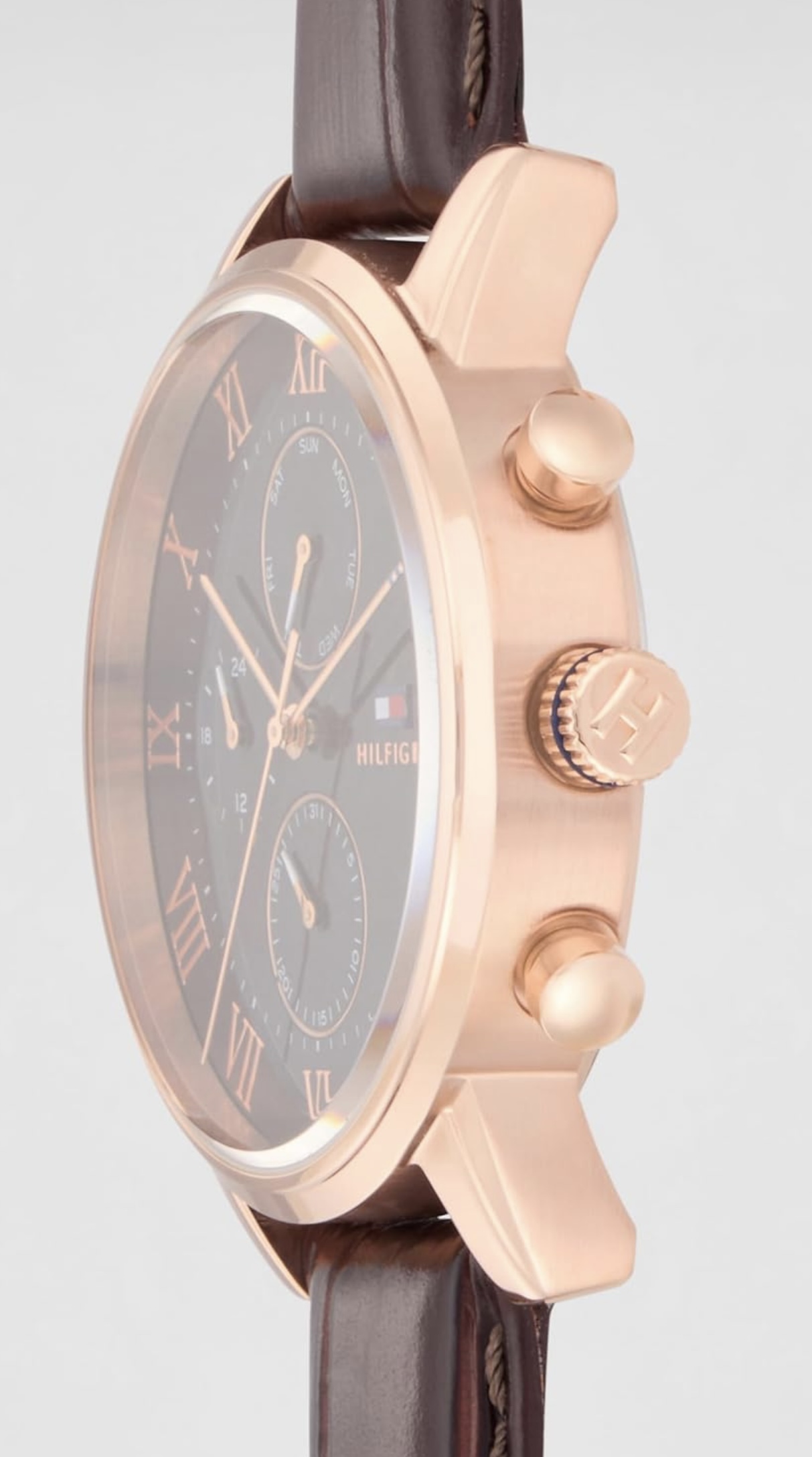 The watch boasts a 44mm round metal case that offers a robust yet sleek appearance. The mineral glass dial cover ensures durability while providing a clear view of the time. The brown leather strap not only enhances its classic look but also provides a comfortable and secure fit on your wrist.