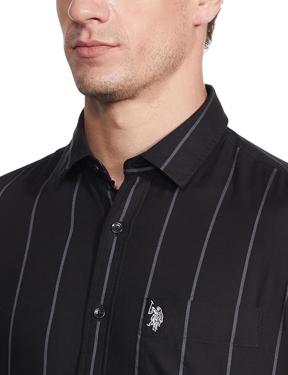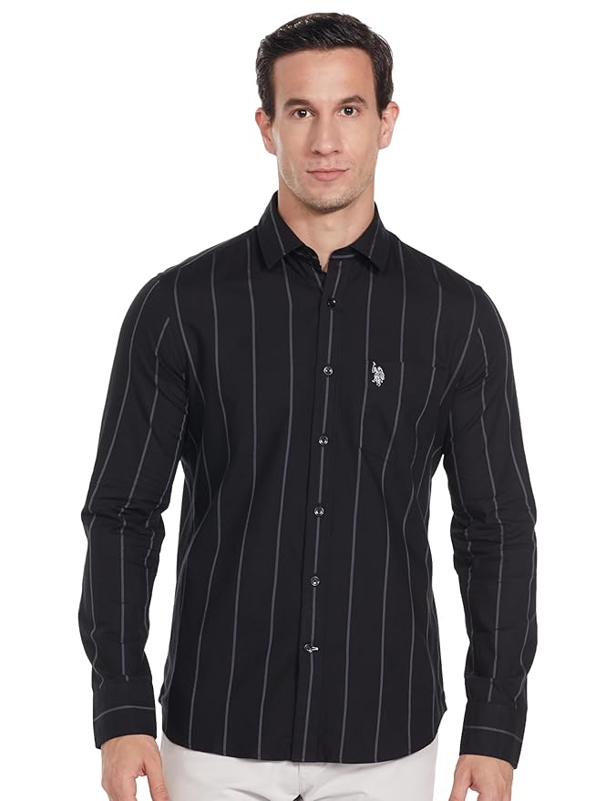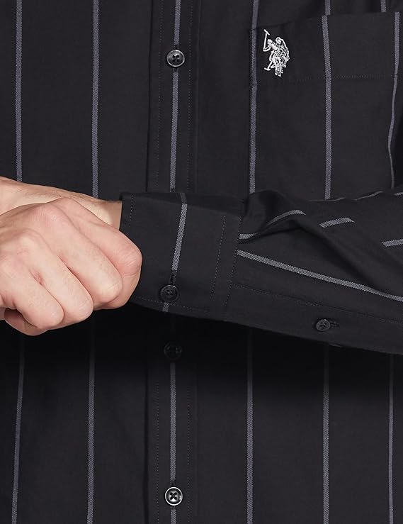 The U.S. POLO ASSN. Men’s Striped Tailored Fit Shirt combines classic design with a modern edge. Crafted from 100% cotton twill stripe fabric, it offers a smooth texture, durability, and breathable comfort for all-day wear. The tailored fit creates a sharp, well-defined silhouette, while the semi cut-away collar adds contemporary sophistication. Featuring long sleeves, standard length, and a modern styling approach, this shirt is versatile enough to pair with formal trousers for the office or chinos and jeans for casual outings. Designed with attention to detail and quality craftsmanship, it reflects the signature U.S. Polo Assn. style.